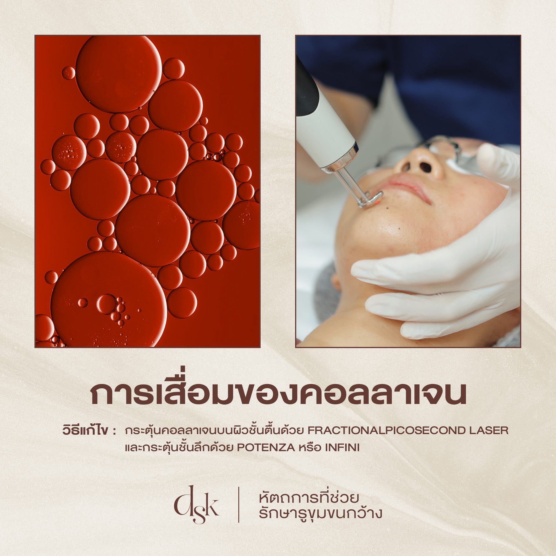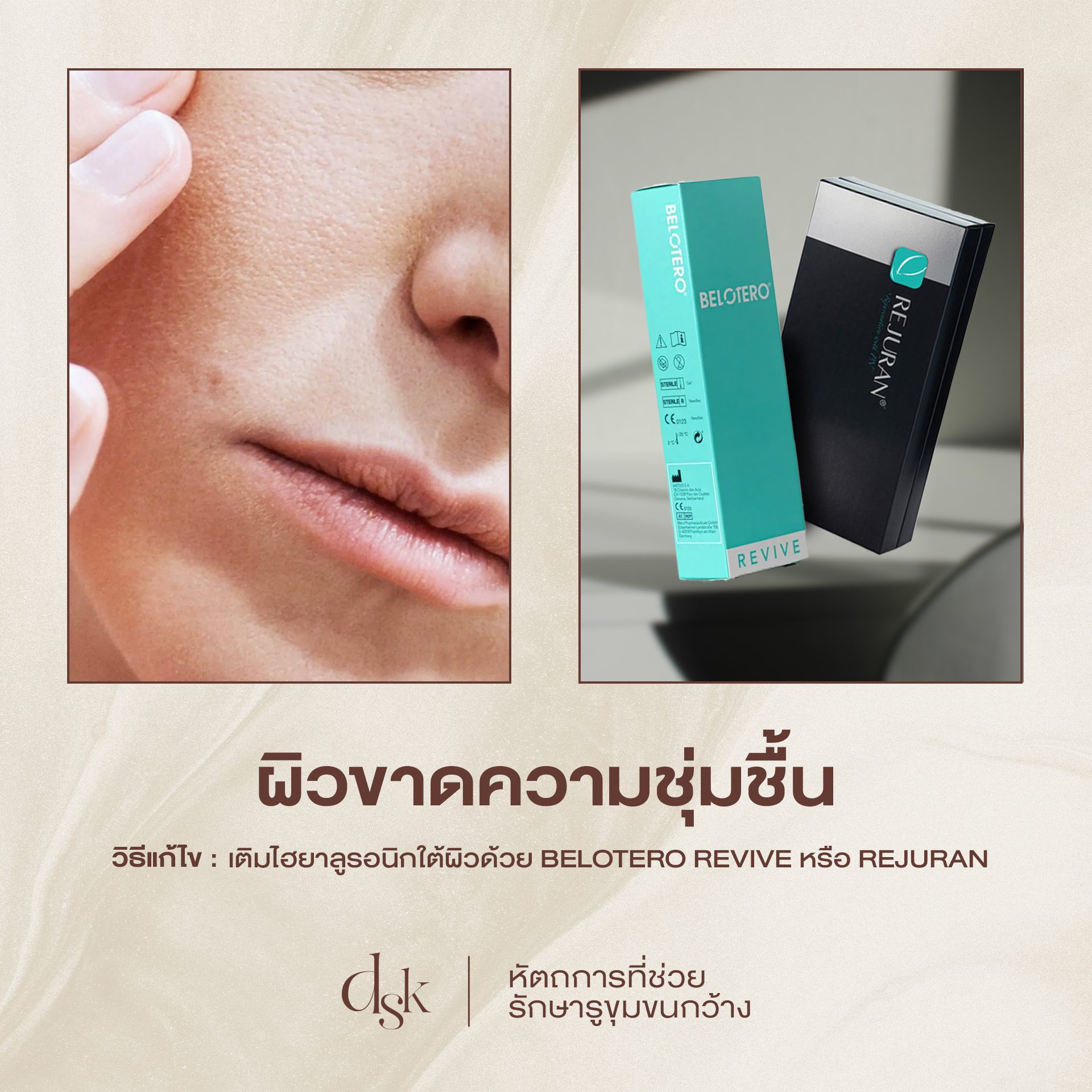 | – รูขุมขนกว้างเกิดจาก กรรมพันธุ์ และองค์ประกอบ 4 อย่าง คือ คอลลาเจน ขนาดเส้นขน ต่อมไขมัน และกรดไฮยาลูโรนิก ซึ่งสามารถแก้ไขได้ด้วยหัตถการทางการแพทย์ – วิธีรักษาที่ได้ผลดีที่สุด คือ ทำ Potenza (RF) เพราะสามารถปรับระดับความลึกได้ กระตุ้นคอลลาเจนได้ทั้งชั้นตื้นและลึก รวมถึงลดการทำงานของต่อมไขมัน และอีกตัวเลือกคือ Picosecond Laser – เครื่องมืออื่น ๆ ที่ช่วยได้ ได้แก่ Thermage (มี Downtime น้อย), Ulthera (ปรับพลังงานที่ชั้น Dermis), YAG Laser (กำจัดขน) และ Botox (ลดการทำงานต่อมไขมัน) – การฉีดผิวสามารถใช้เป็นการรักษาเสริม โดยตัวที่แนะนำคือ Belotero Revive (เสริม HA), Sculptra/Profhilo/Radiesse/Rejuran (กระตุ้นคอลลาเจน) – การรักษาที่ให้ผลดีที่สุด คือ การผสมผสานระหว่าง Potenza + Sculptra / Profhilo + Belotero Revive และเสริม Rejuran สำหรับความกระจ่างใสและความโกลว์ของผิว ซึ่งทั้งหมดนี้ สามารถรักษาได้ครบทั้งหมดที่ DSK Clinic |