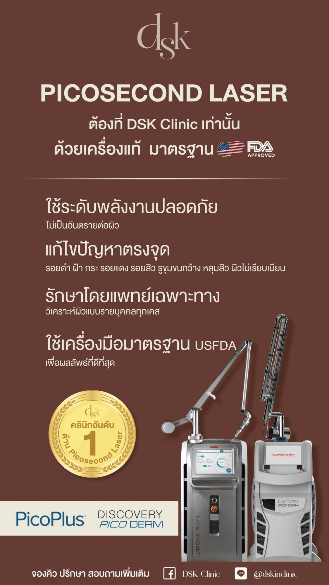 ที่ DSK เรามีโปรแกรม Discovery Pico และโปรแกรม Picoplus ซึ่งเป็น 2nd Generation Picosecond Laser 2 รุ่นที่ดีที่สุด เพื่อ “การออกแบบการรักษา และวางแผนเทคนิคการรักษาเฉพาะบุคคล” ที่ให้ผลลัพธ์น่าพอใจที่สุด และนอกจากเครื่องโปรแกรม Picosecond Laser แล้ว ที่ DSK เรายังมีทุกเทคโนโลยีเฉพาะที่ดีที่สุดสำหรับแต่ละปัญหาผิว เพื่อให้คนไข้ได้รับ “สิ่งที่เหมาะสม” จริง ๆ