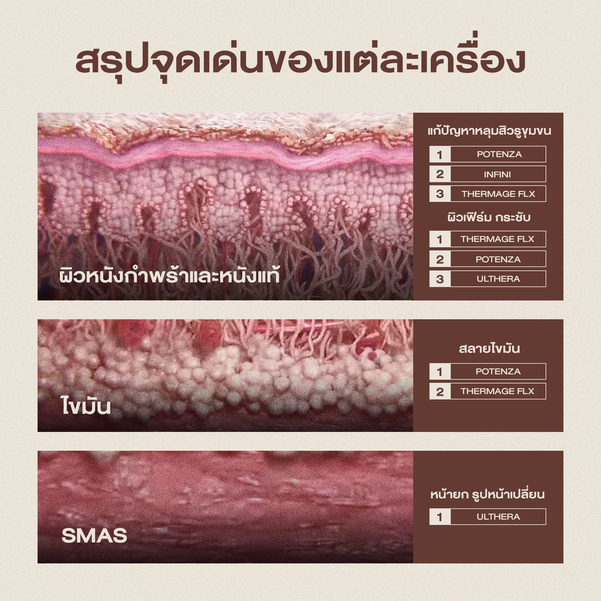 แต่ละเครื่องยกกระชับทำงานกับชั้นผิวที่ต่างกัน