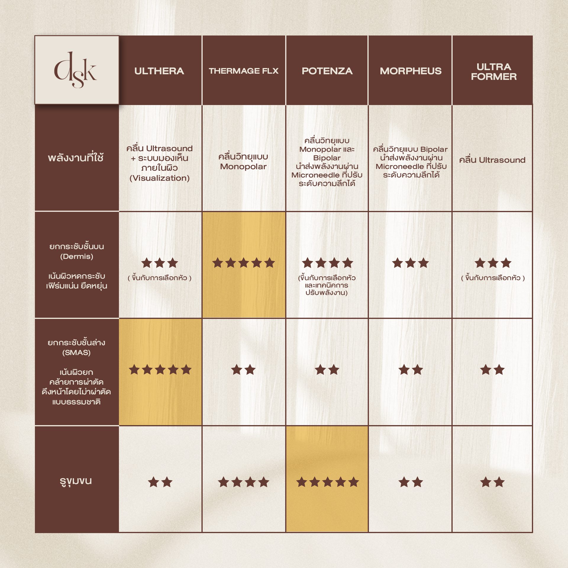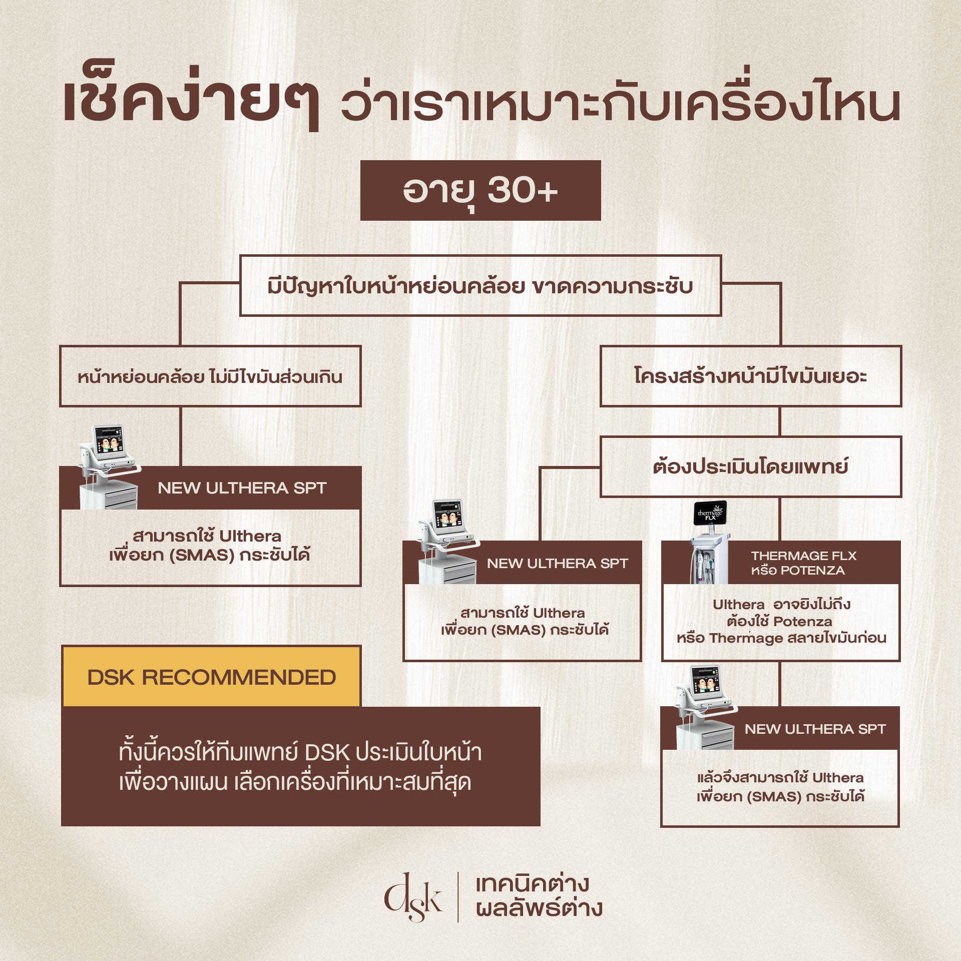 - DSK Lifting Excellence Center เพราะที่ DSK เรามีเทคโนโลยีในการยกกระชับครบทั้ง Ulthera ThermageFLX Potenza Sculptra Radiesse Filler และ Botox แพทย์จึงสามารถเลือกสิ่งที่เหมาะสมที่สุดให้กับคนไข้ได้อย่างตรงไปตรงมา และสามารถผสมผสานการรักษาเข้าด้วยกัน เพื่อให้ได้ผลลัพธ์สูงสุดได้