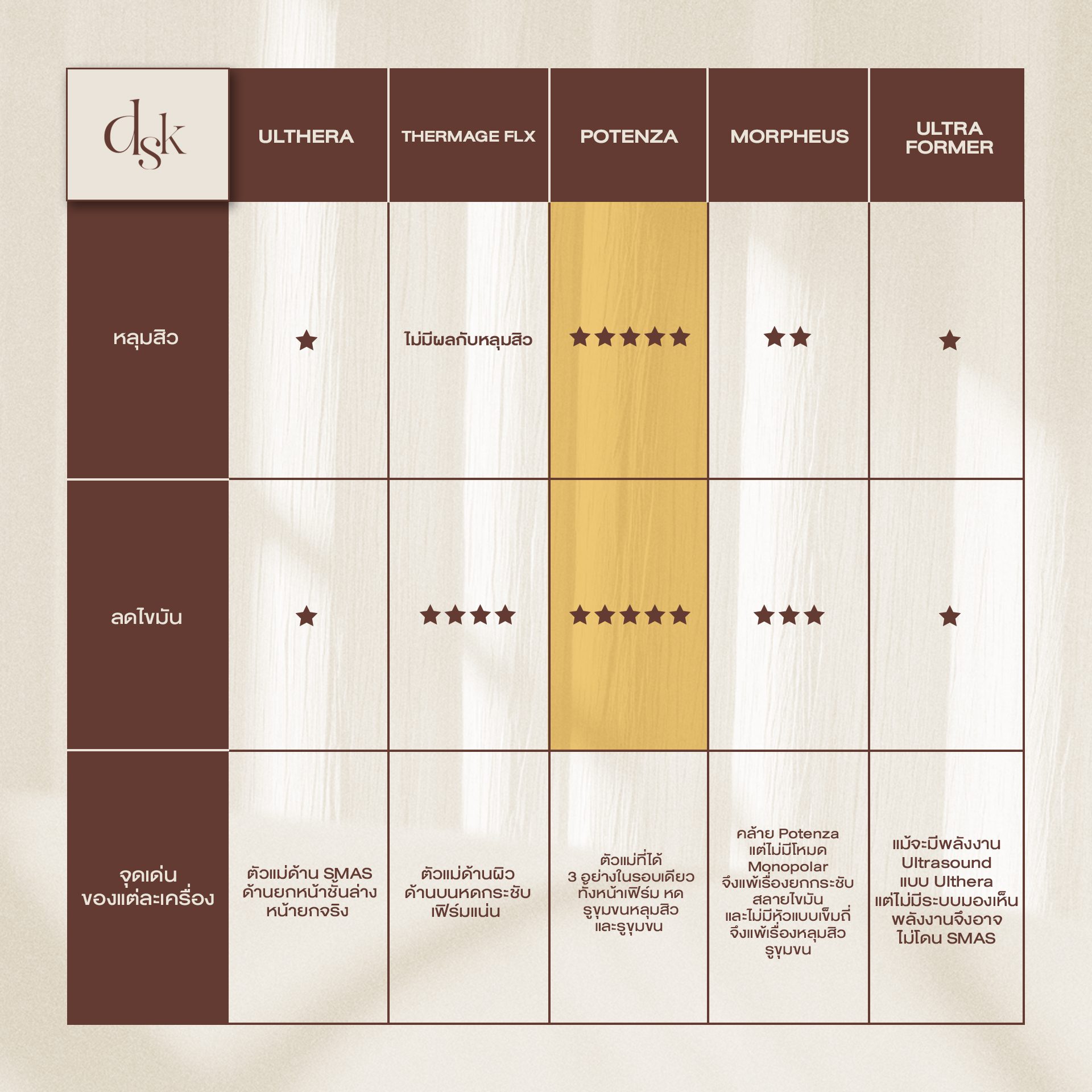 เหตุผลที่ DSK Clinie เลือกที่จะมีเครื่องยกกระชับหลาย ๆ เครื่อง ทั้ง Ulthera Thermage FLX และ Potenza ก็เพราะว่า “คนไข้” แต่ละท่าน มีปัญหาความหย่อยคล้อยด้วยสาเหตุที่แตกต่างกัน แพทย์จึงต้องมี “ตัวเลือก” ที่เหมาะสมกับแต่ละเคส เพื่อที่แพทย์จะได้ไม่ต้อง “ยัดเยียด” การรักษาเฉพาะเครื่องใดเครื่องหนึ่งเท่านั้น ลองดูคลิปด้านล่างเลย