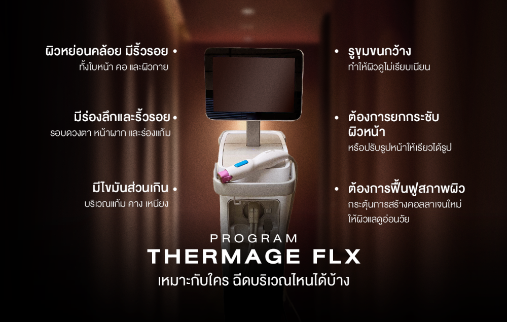 โปรแกรม Thermage FLX คือ เครื่องมือยกกระชับผิวที่ใช้ความถี่จากคลื่นวิทยุความแรงสูง ส่งพลังงานคลื่นลงลึกเข้าไปถึงชั้นผิวหนังแท้ และชั้นไขมันใต้ผิวหนัง โดยความร้อนของคลื่นพลังงานสามารถกระตุ้นการสร้างคอลลาเจนใหม่ และช่วยให้คอลลาเจนที่หย่อนคล้อยมีความกระชับมากขึ้น ช่วยปรับผิวให้เต่งตึง เรียบเนียน อีกทั้งยังช่วยให้ใบหน้ากลับมาสดใส ไร้ริ้วรอย แลดูอ่อนเยาว์